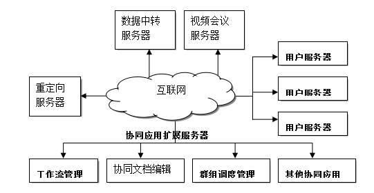 触点通视频电话协同办公部分完全采用P2P的方式进行数据交互,大大节省了服务器资源负载和带宽负载。如下图: