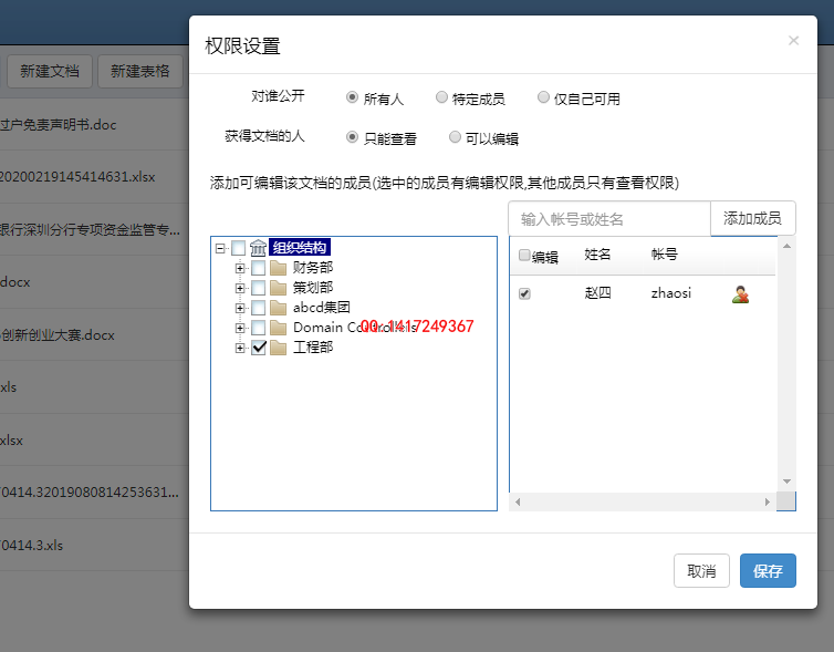 弹出权限设置对话框,这里如果选择了对所有人公开,并且获取文档的人只能查看,添加了可编辑该文档的成员后,选中的成员有编辑权限