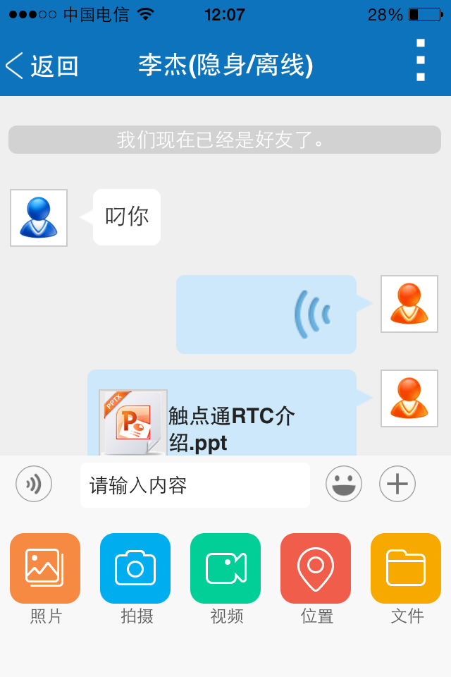 触点通轻办公融合了即时消息、短信、邮件以及语音视频、文件传输、群组等多种沟通方式,以沟通交流为核心、以企业管理为基础、以商务协作为应用,实现“随时、随地、随身”的交流,“可管、可控、可表”的管理,“一站式、全方位”的应用。